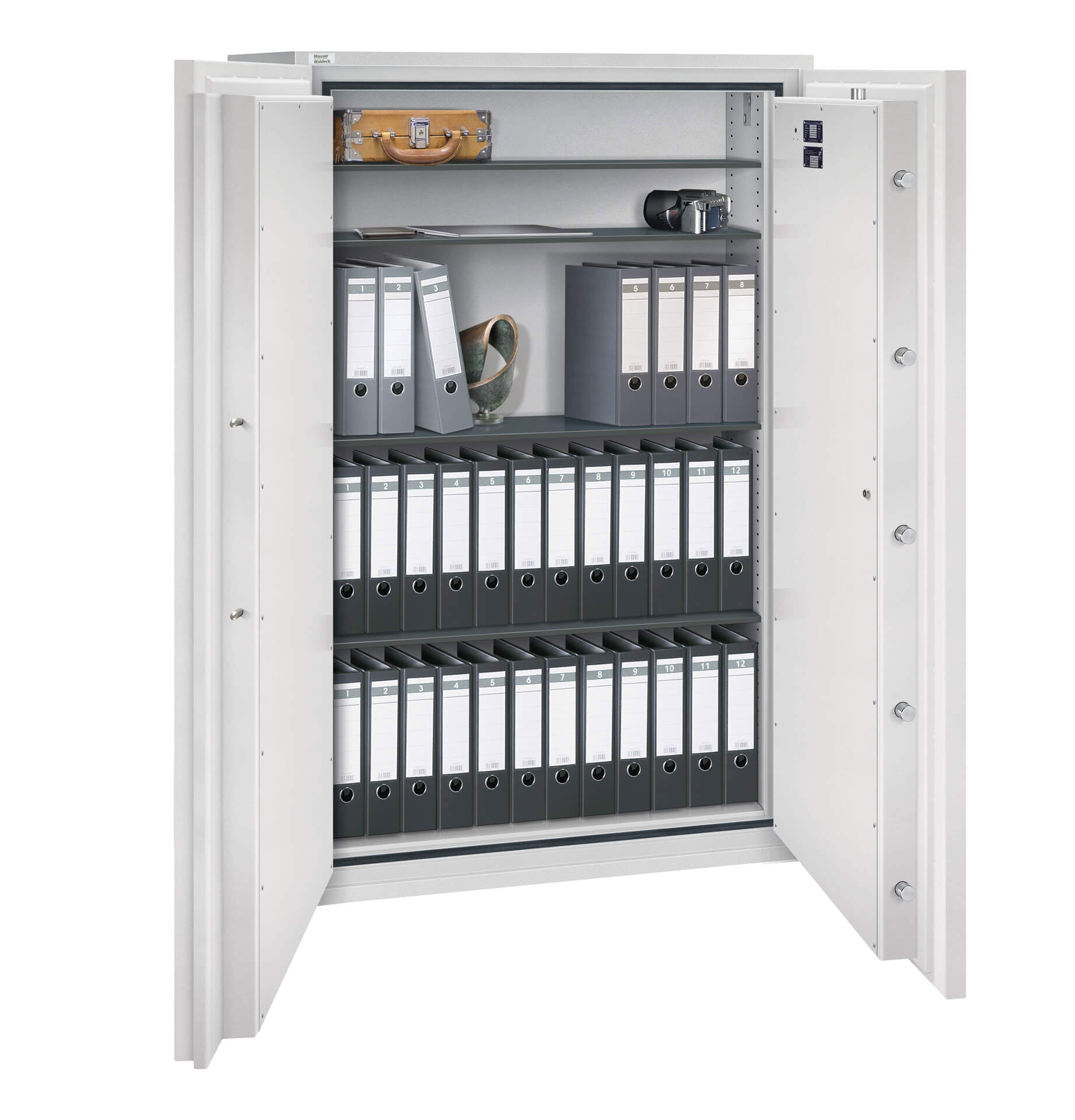 Der Widerstandsgrad V dieser Modelle verspricht einen sehr hohen Schutz vor Einbruch. Der Tresorkorpus aus Stahl mit zusätzlicher Verstärkung und auch die Tür sind dreiwandig und mit feuerbeständigem Spezialbeton gefüllt. Die Tresortür wird zusätzlich durch eine Schweiß- und Schneidbrennsicherung im Verschlussbereich sowie durch 40 mm starke, massive Riegelbolzen aus Stahl und einer Spezialpanzerung des Riegelwerks geschützt. Massive Hintergreiferbolzen verhindern ein Aufhebeln der Tür auch bei durchtrennten Scharnierbändern. Bohrsichere Zusatzsicherungen an allen Sperrpunkten und ein Notverriegelungsmechanismus runden den Wertschutzschrank ab.
